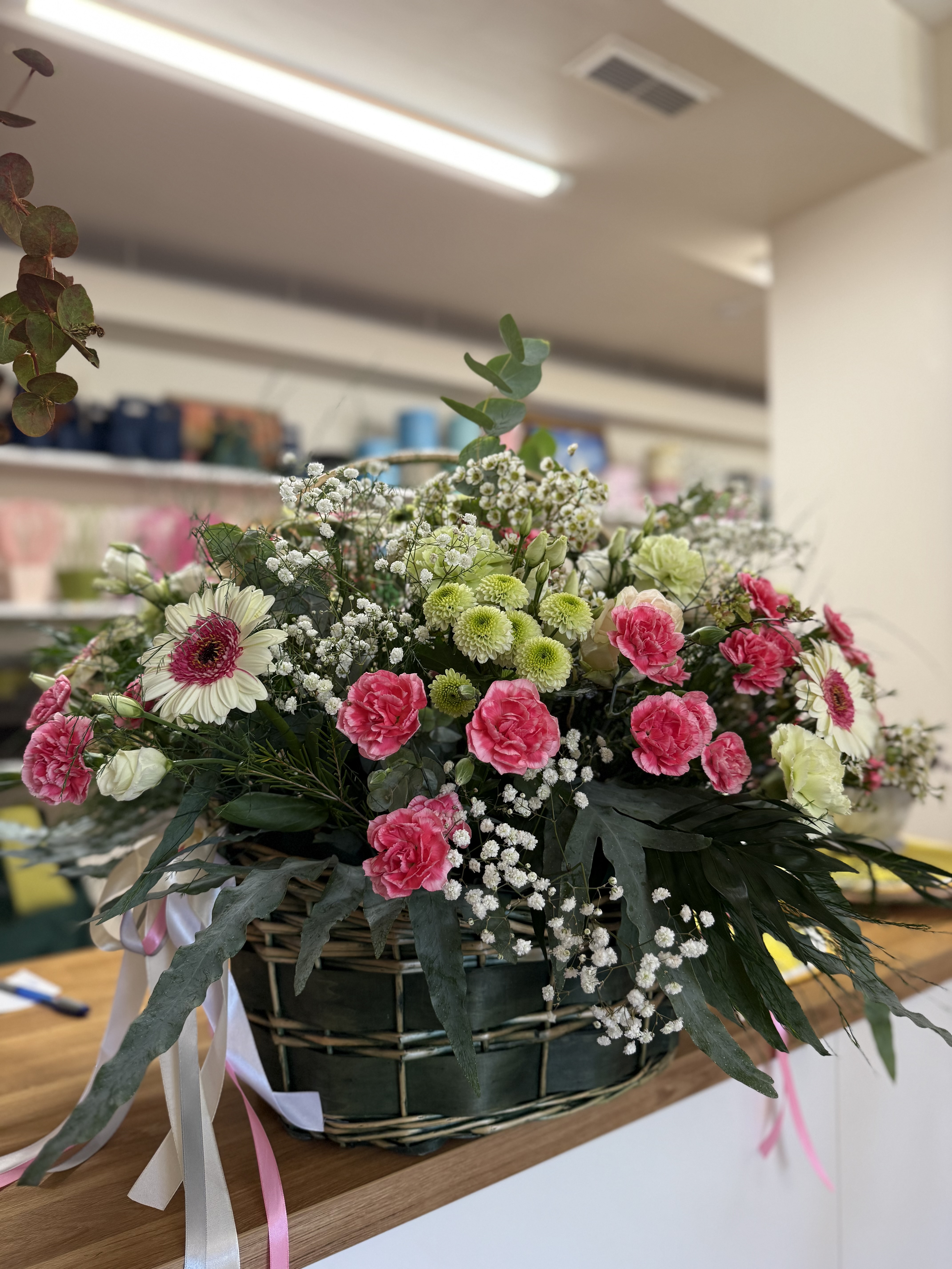 Groza augstums 60cm, platums 45cm. Attēlam ir ilustratīva nozīme, ziedu klāsts pušķī var atšķirties.