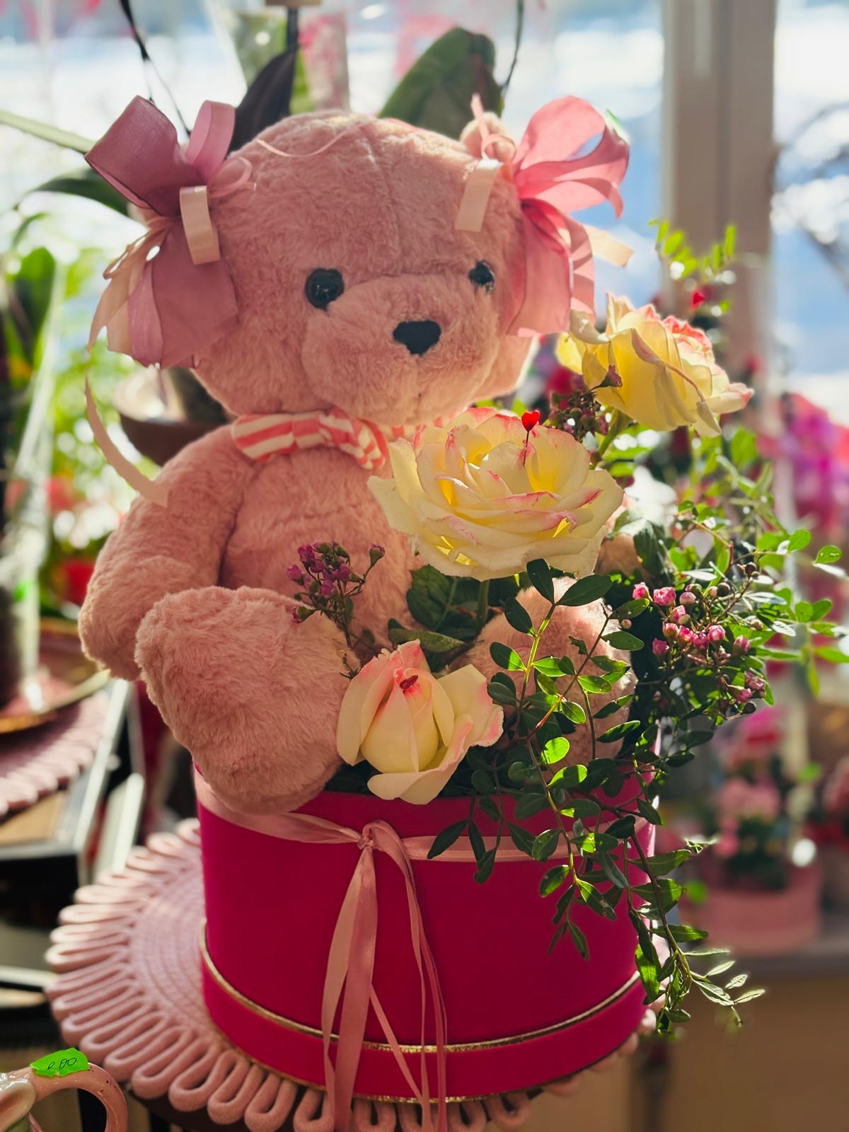 Lācis kastē ar ziediem. Attēlam ir ilustratīva nozīme, ziedu klāsts pušķī var atšķirties.