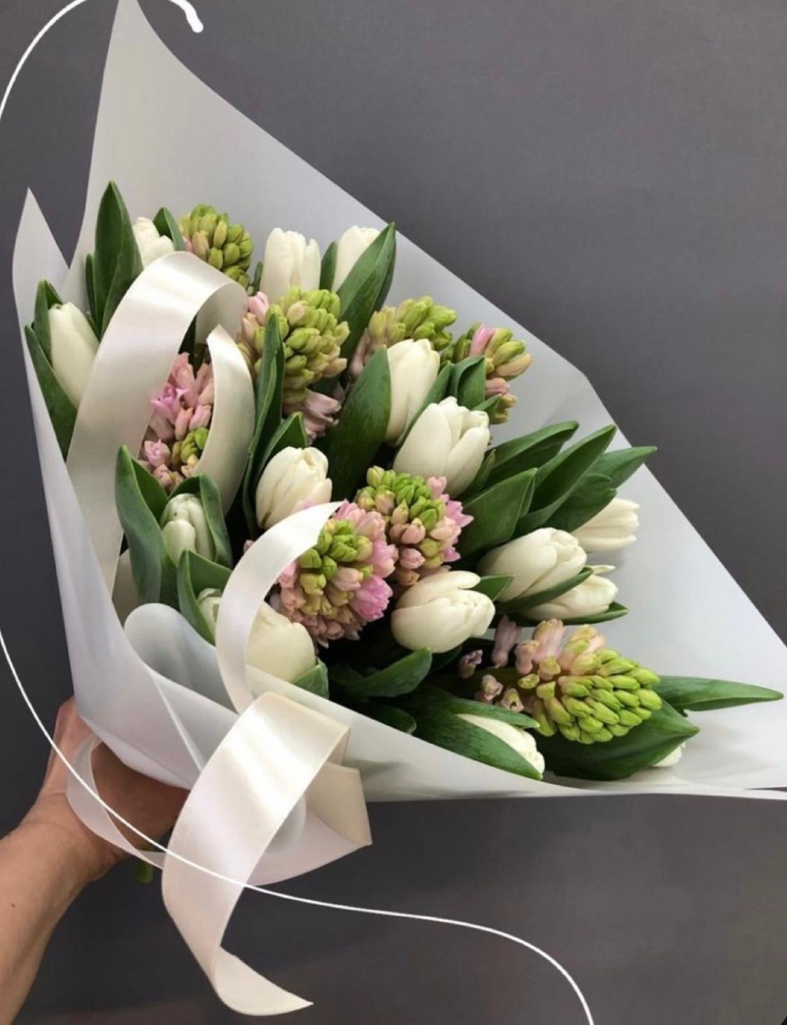 Tulpju un hiacinšu ziedu kompozīcija dekoratīvajā papīrā sasieta ar lentu. | Ozo Ziedi | Ozo Ziedi