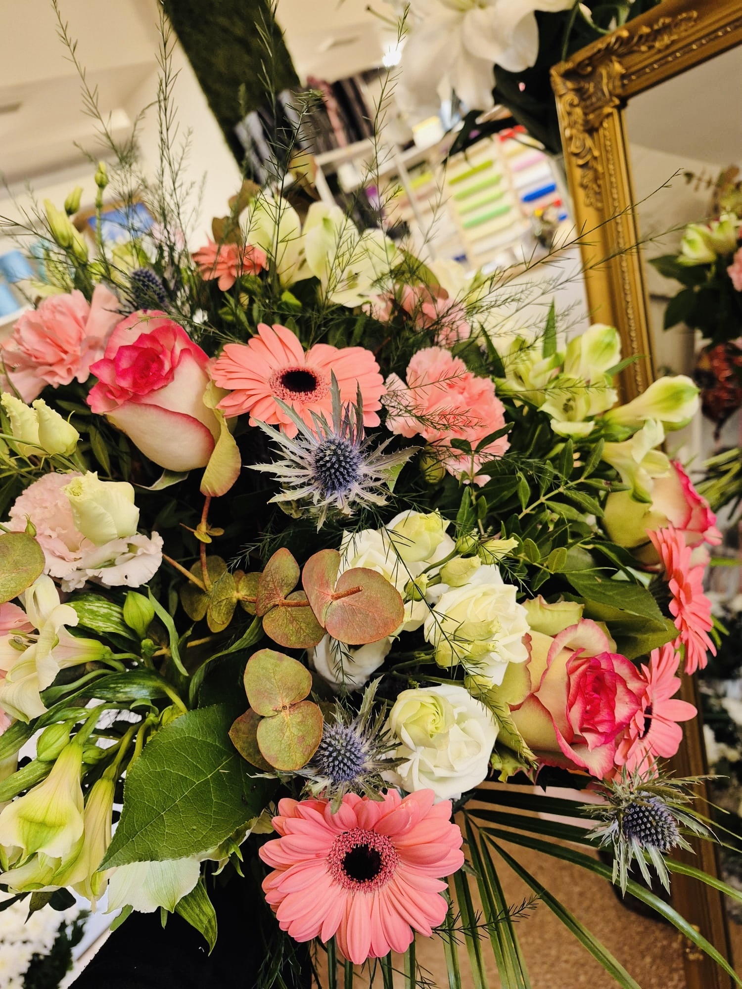 Diametrs apmēram 70 cm. Attēlam ir ilustratīva nozīme, ziedu klāsts kompozīcijā var atšķirties.
